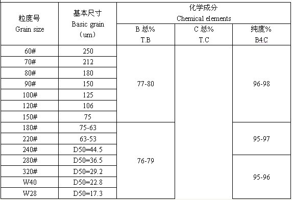 碳化硼是最硬的人造磨料之一,硬度僅次于金剛石,其硬度為9.36,研磨效率高,適用于各種硬質(zhì)合金,寶石等材料的研磨、拋光、鉆孔等加工,是金剛石的理想代用材料。碳化硼也是工程制品,耐火材料,特殊焊接的主要原料,可制成耐磨焊條、各種高級快速切削刀具和耐磨程度極高的磨具、噴砂嘴、密封環(huán)和精密量元件等。碳化硼比重2.52g/cm3.熔點2450度,耐高溫與堿不起反應(yīng),具有吸收中子和半導(dǎo)體導(dǎo)電性質(zhì),是制造硼化鈦等金屬硼化物,硼鋼和核工業(yè)中子吸收劑等不可缺少的材料。